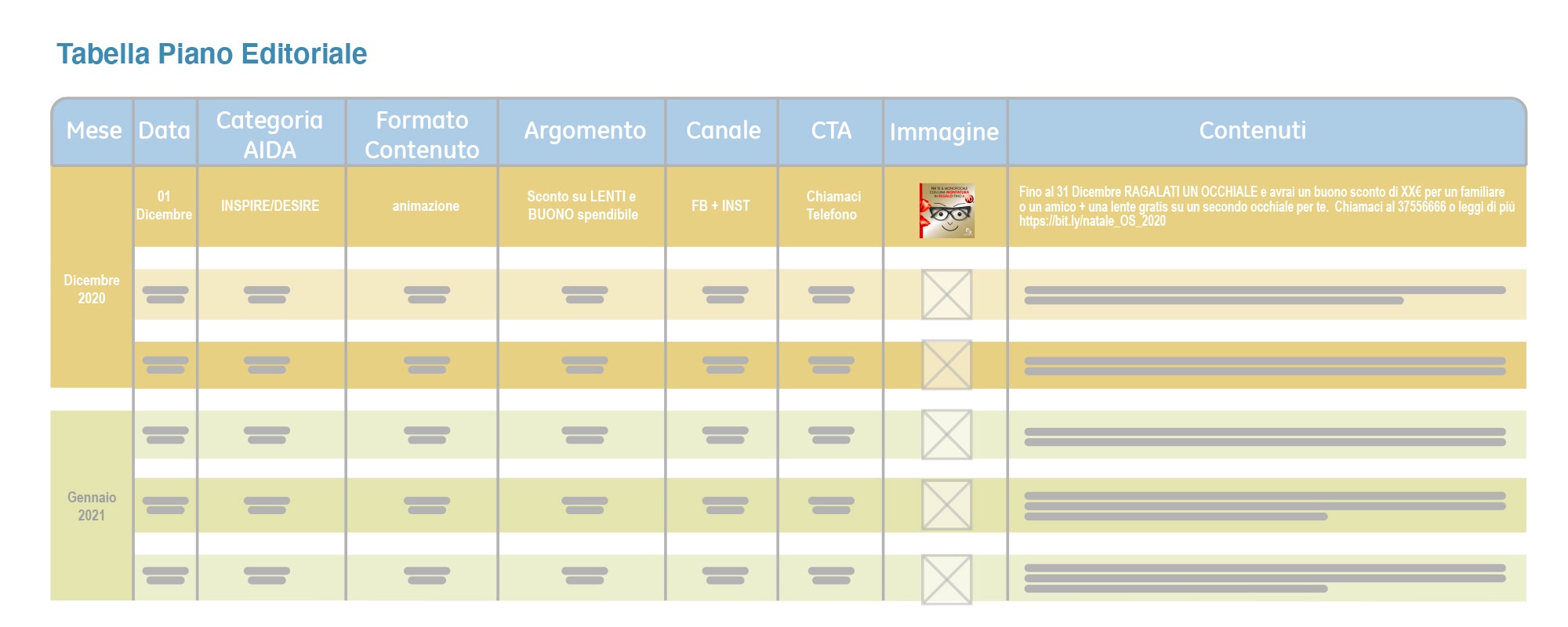 La Content Strategy è uno strumento di marketing strategico che traduce gli obiettivi di business in un piano di contenuti multidimensionale. La matrice mette in relazione valori di posizionamento, messaggi chiave, target, canali, metriche di misurazione in una successione di contenuti che tende verso la conversione alla vendita (A.I.D.A.R.).